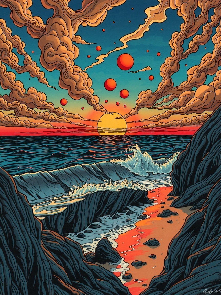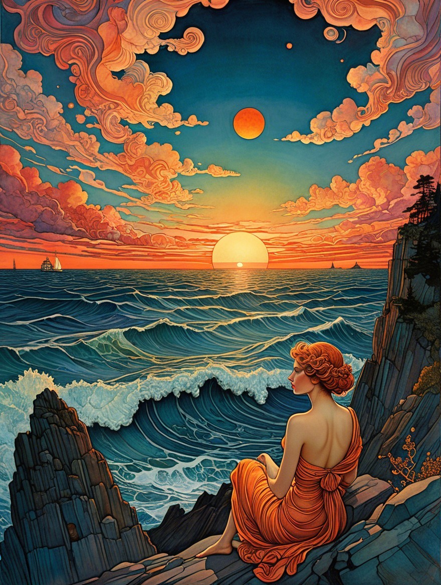 Woman in Orange Dress at Sunset Over Ocean Cliff