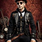 A striking figure in a leather coat and tall hat stands confidently, flanked by ominous companions. The scene features dark themes, skull imagery, and a blend of vintage and punk aesthetics.