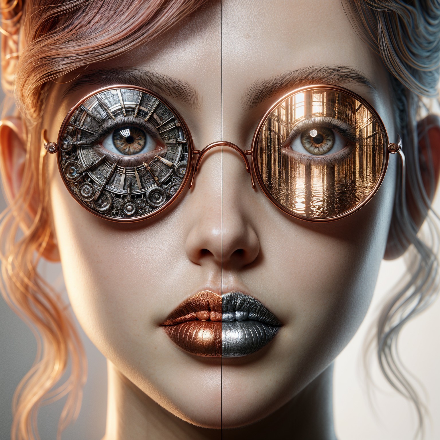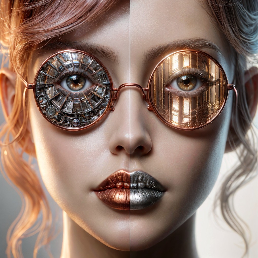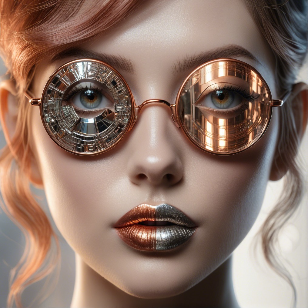 A close-up portrait of a woman with unique round glasses featuring reflective lenses. Her lips are artistically painted in metallic copper and silver shades, creating a futuristic look.