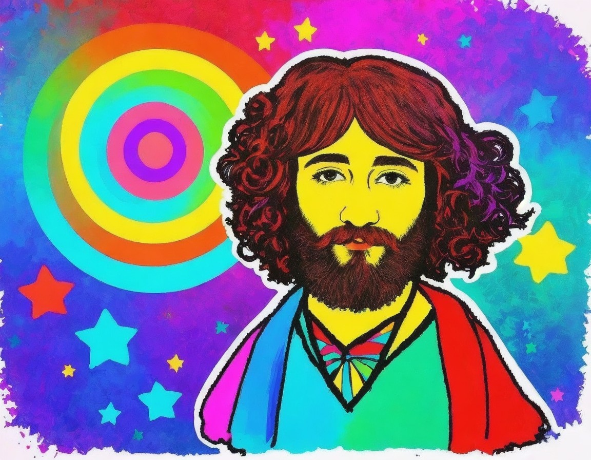 Colorful pixel art portrait with long-haired figure against rainbow swirl backdrop