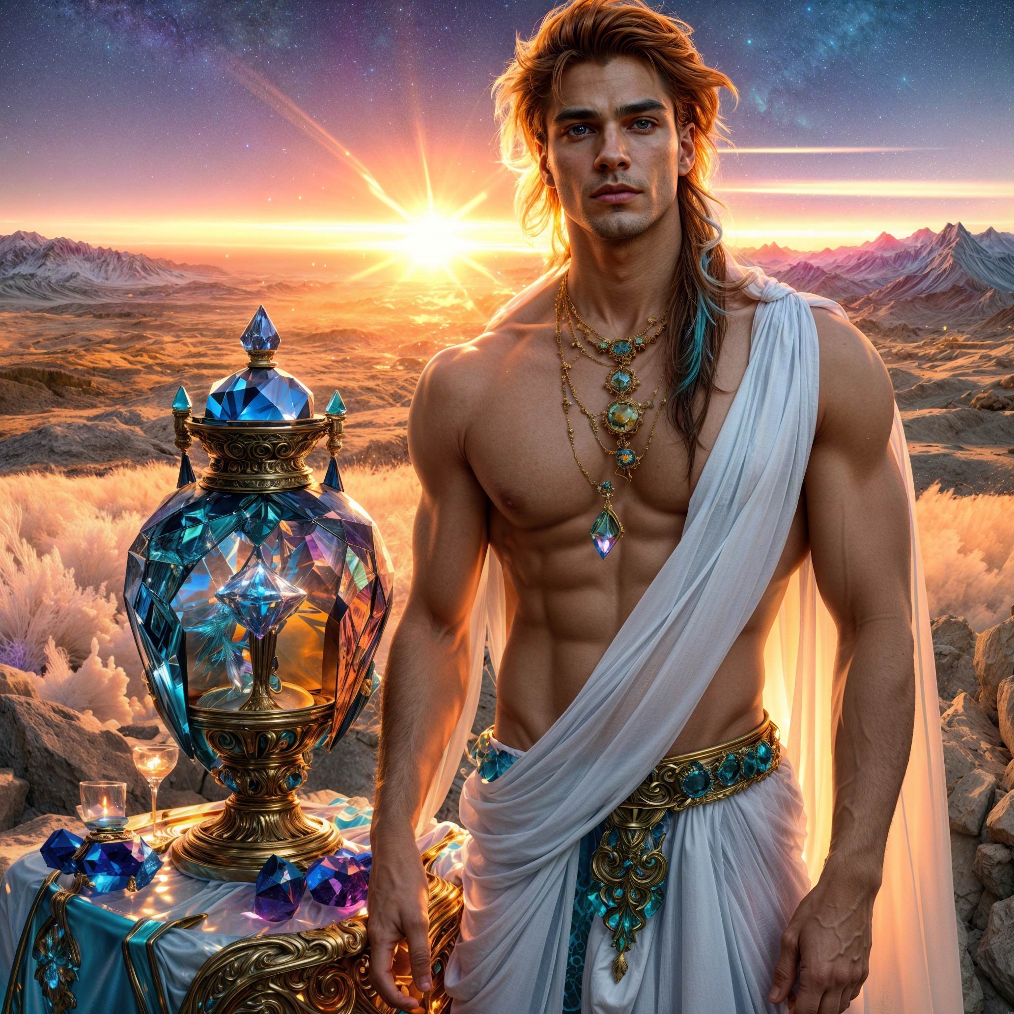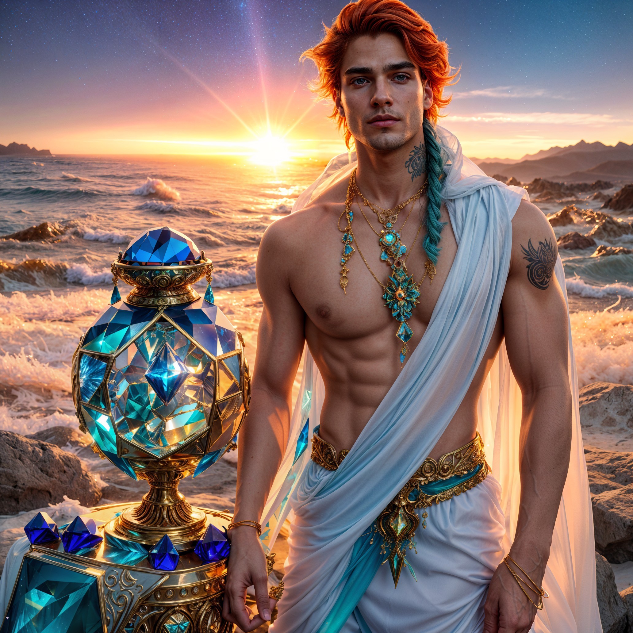 A muscular man stands confidently by the sea at sunset, wearing a flowing white robe adorned with jewels. He is surrounded by ornate, colorful artifacts, blending elegance with strength.