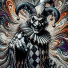 A sinister jester with a twisted grin stands out against a swirl of vibrant colors. His outfit features a classic black and white diamond pattern, enhancing his eerie, otherworldly presence.