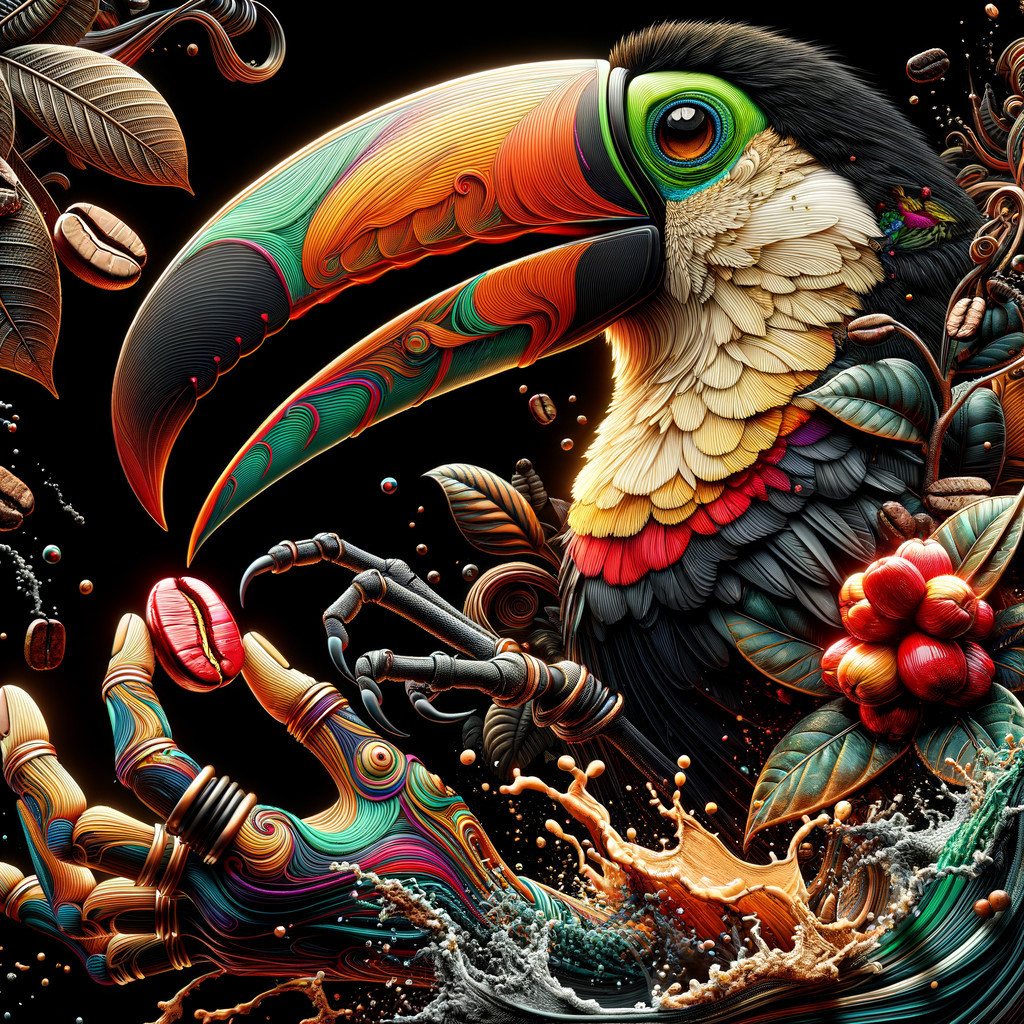 Vibrant illustration of a toucan amid lush greenery with rich reds and soothing earth tones, showcasing its striking beak and vivid plumage.
