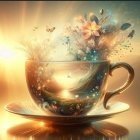 The image depicts a woman in a flowing gown, standing among vibrant sunflowers under a radiant sunset. Her hair flows gracefully, embodying beauty and serenity in a dreamlike atmosphere.