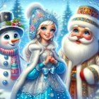 In a winter wonderland, a cheerful girl in a blue dress stands with a jolly Santa and a friendly snowman. All are surrounded by snowy trees and colorful Christmas decorations.