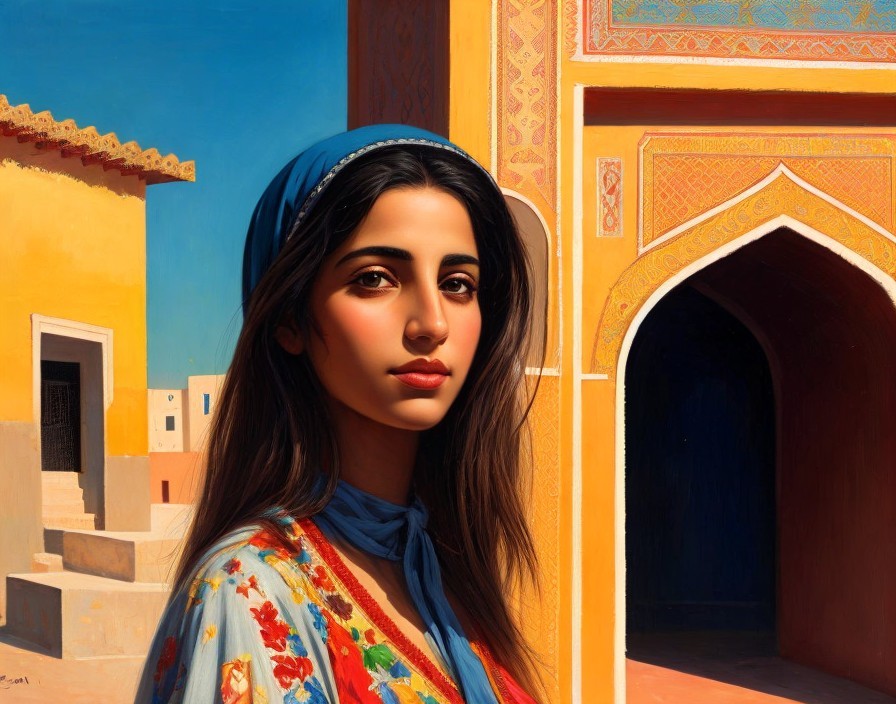 Woman with Dark Hair and Blue Headscarf by Sunlit Arabic Archway