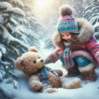 A young girl in a colorful winter coat kneels in a snowy forest, gently touching a teddy bear on the ground. Snowflakes fall amidst evergreen trees, creating a magical winter scene.