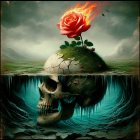 A skull with a vibrant red rose grows from it, set against a backdrop of a tranquil ocean and towering cliffs. The scene merges beauty and decay, evoking themes of life and death.