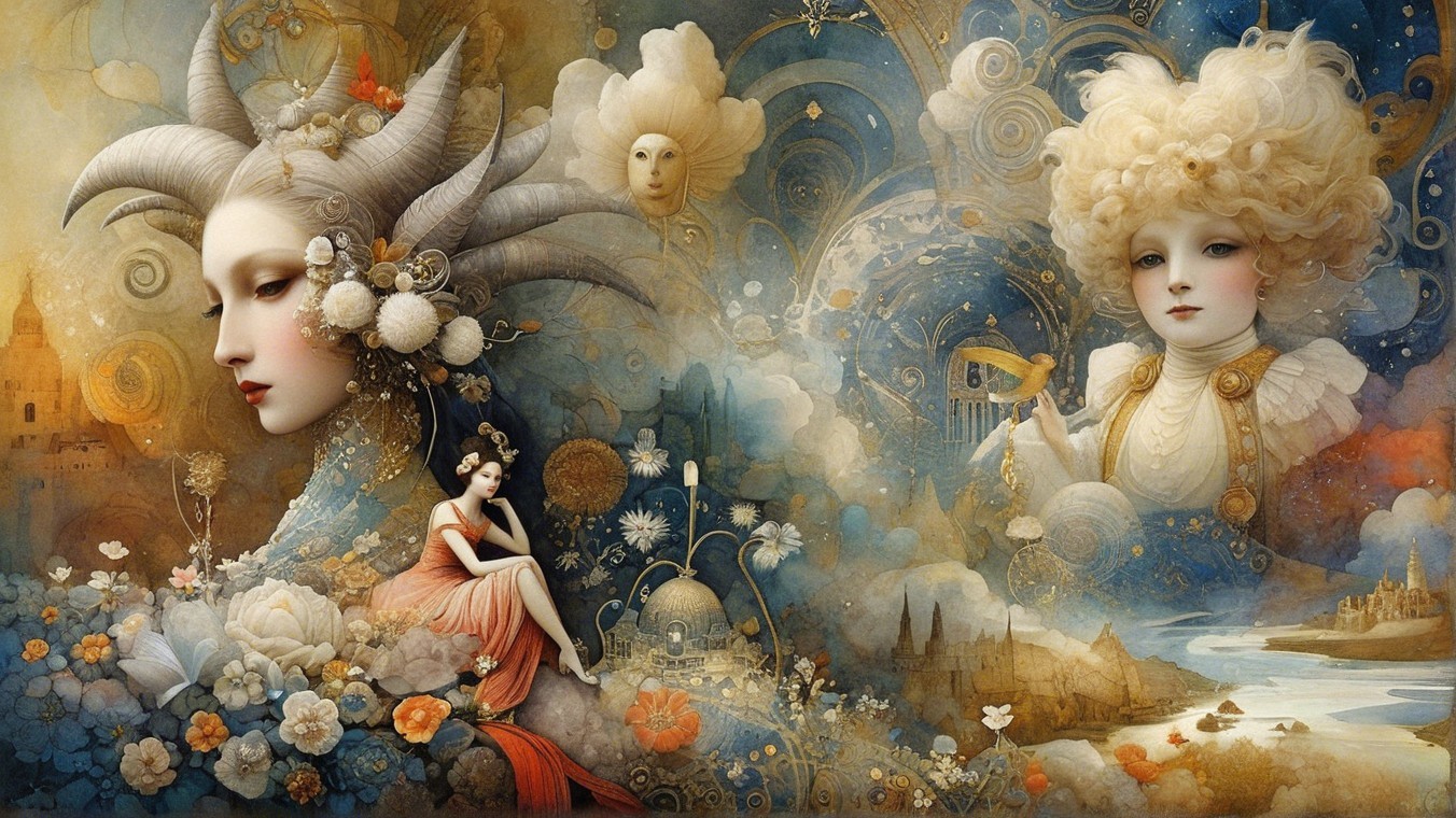 The artwork features ethereal female figures adorned with celestial elements and flowers, set against a dreamy backdrop of moons and cosmic hues, creating a mystical atmosphere.