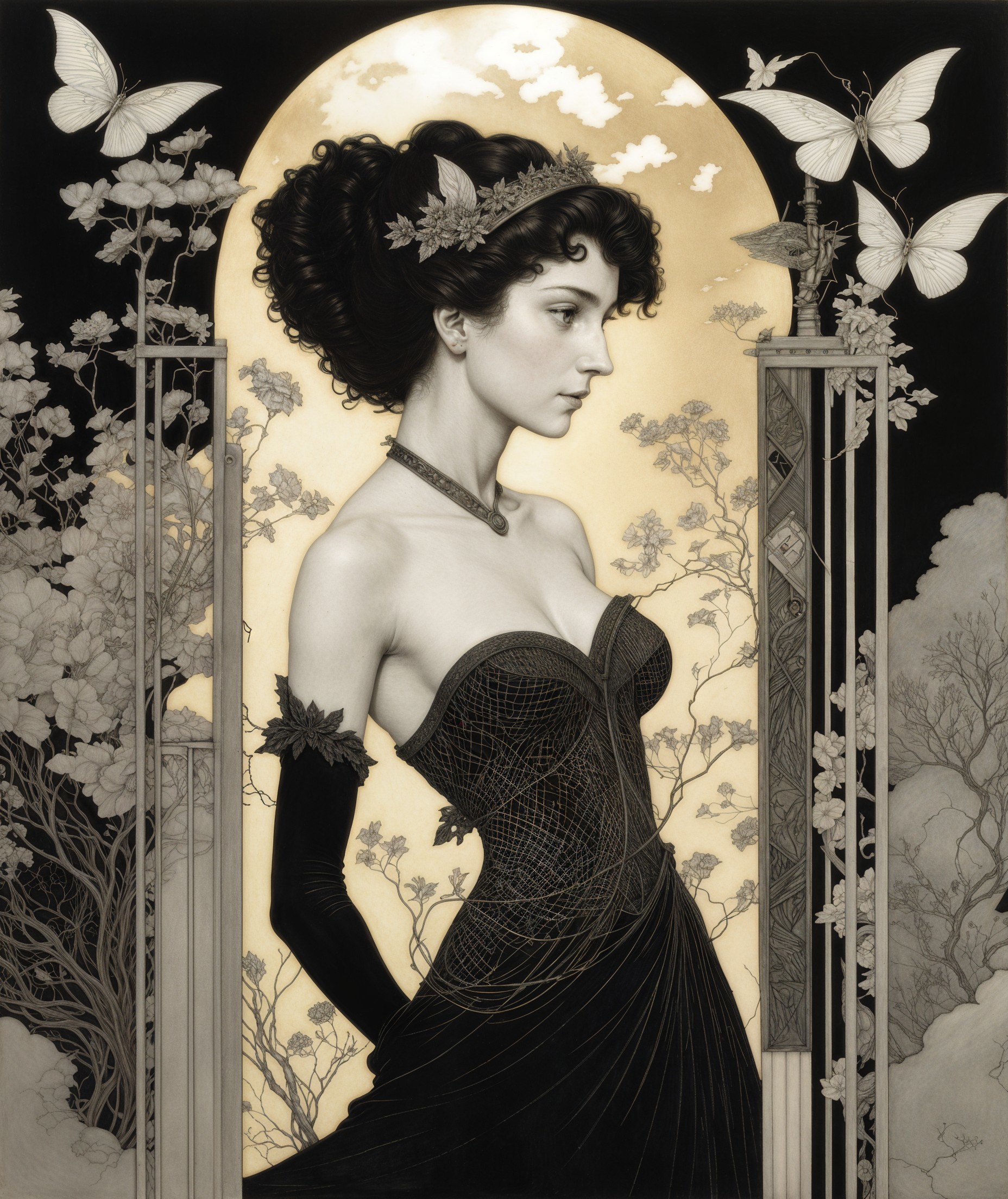 A striking portrait of a woman in elegant black attire, adorned with a necklace and gloves, flanked by two ethereal white birds. The backdrop features towering marble columns and a glowing aura.