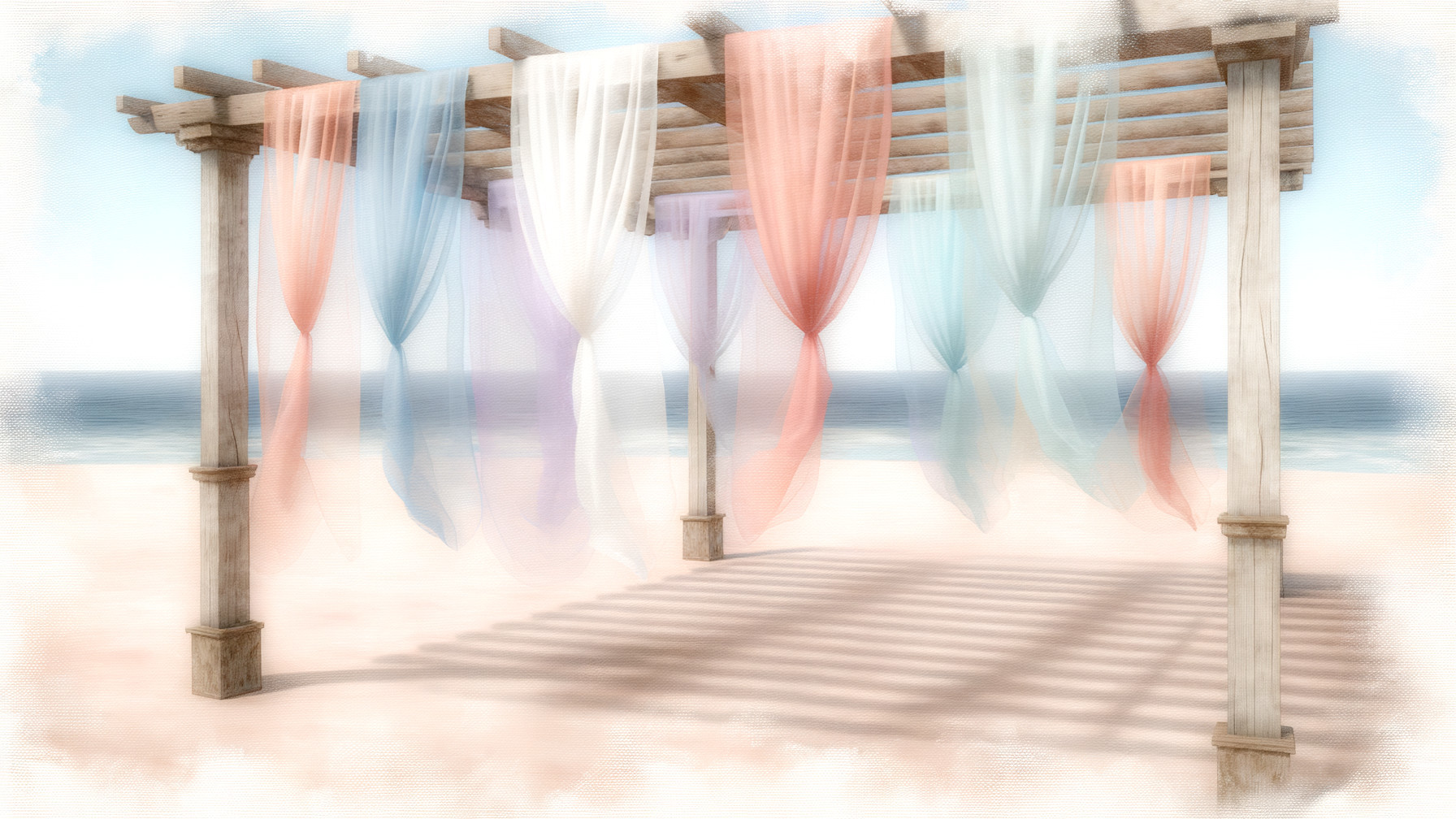 A serene beach scene features a wooden pergola adorned with flowing pink fabric and vibrant floral arrangements, overlooking gentle waves and a clear blue sky, evoking a romantic atmosphere.