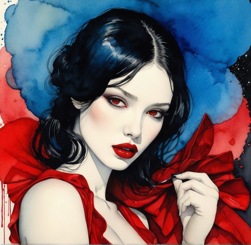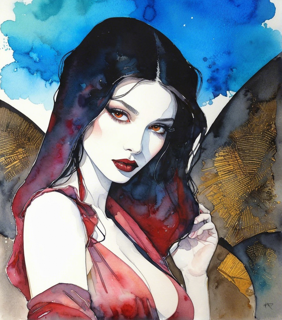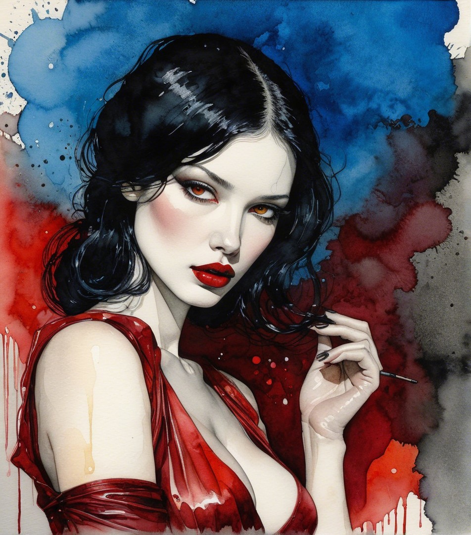 + Prompt:Stylized portraiture, watercolor and ink art by Dave McKean. Surreal, whimsical details. Scratchings, hatching, contoured. Background inspired by Moebius and Enki Bilal & Dan Witz, tints by Rosina Wachtmeister, plasticity 1.4, wet on wet watercolors. Dark red lips, multi-layered eyes, stippled, blotted, tesselated, depth and forethought in composition, emulsion shifts, transitions, catenaries, beautiful indirect light bio-luminescent gouache motif, dof, debeh, bokeh, line-art, brightness 1.3, quilling double exposure merging extremely detailed cubism by Juan Gris and Man Ray and Piet Mondrian, moody, demonic, strange, ghostly, brightness 1.9, opaque, translucent, layered, eerie, dark fantasy reminiscence, creepy, scary, supernatural , fine micro-pen lines, watercolor effects akin to psychedelic comic-book cover art, american gothic, triadic color scheme of light-yellow, warm pink, and light-blue in textures, stippled shadow effects, visible textures, coherent line-artwork by Marc Allante, delicate warm tones in watercolor and ink style, tesselated outlines, stacked lines, tall and lean hues by Ed Binkley, Wet on wet painting, fantasy, tonalism, unparalleled detail, splash ink technique in style of Marc Allante, colorful yam, warm coloring, dark-yellow, metallic-honey, rounded edges, Pencil and Pastels, ink and alcohol, highly stylized art merged with fantasy illustration,ubsurface scattering 1.2, contoured, warm orange, red, yellow tones, cubistic-inspired background, swirling patterns, dynamic lighting 1.5, geometrical line-art, warm red gradients, soft red hues, catenaries, lineage, abstract organic shapes, intricate geometrical lineage, industrial, overall composition by Stan Lee and Renny Tait.