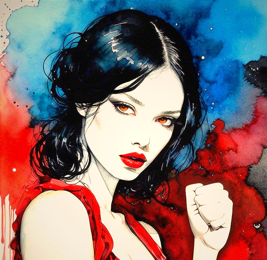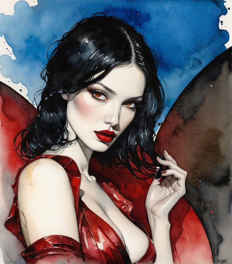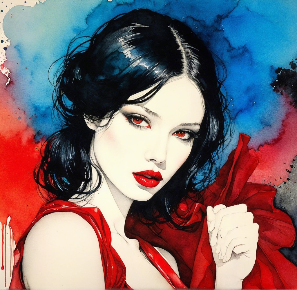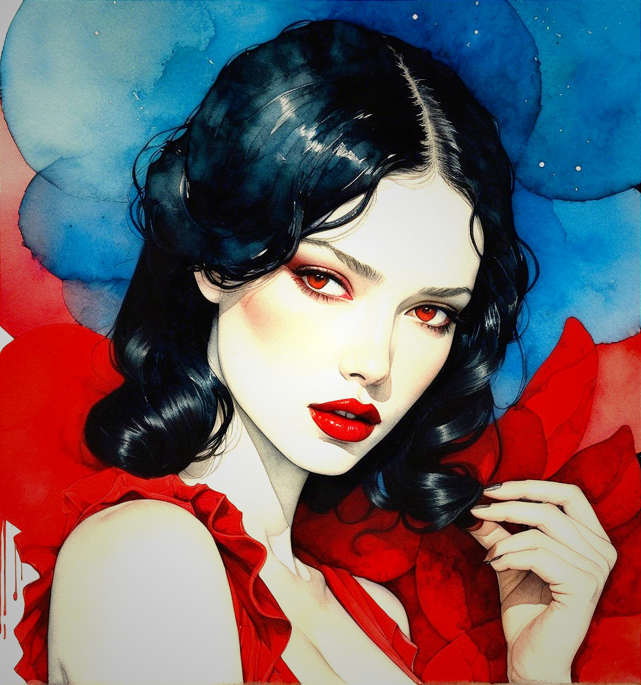 + Prompt:Stylized portraiture, watercolor and ink art by Dave McKean. Surreal, whimsical details. Scratchings, hatching, contoured. Background inspired by Moebius and Enki Bilal & Dan Witz, tints by Rosina Wachtmeister, plasticity 1.4, wet on wet watercolors. Dark red lips, multi-layered eyes, stippled, blotted, tesselated, depth and forethought in composition, emulsion shifts, transitions, catenaries, beautiful indirect light bio-luminescent gouache motif, dof, debeh, bokeh, line-art, brightness 1.3, quilling double exposure merging extremely detailed cubism by Juan Gris and Man Ray and Piet Mondrian, moody, demonic, strange, ghostly, brightness 1.9, opaque, translucent, layered, eerie, dark fantasy reminiscence, creepy, scary, supernatural , fine micro-pen lines, watercolor effects akin to psychedelic comic-book cover art, american gothic, triadic color scheme of light-yellow, warm pink, and light-blue in textures, stippled shadow effects, visible textures, coherent line-artwork by Marc Allante, delicate warm tones in watercolor and ink style, tesselated outlines, stacked lines, tall and lean hues by Ed Binkley, Wet on wet painting, fantasy, tonalism, unparalleled detail, splash ink technique in style of Marc Allante, colorful yam, warm coloring, dark-yellow, metallic-honey, rounded edges, Pencil and Pastels, ink and alcohol, highly stylized art merged with fantasy illustration,ubsurface scattering 1.2, contoured, warm orange, red, yellow tones, cubistic-inspired background, swirling patterns, dynamic lighting 1.5, geometrical line-art, warm red gradients, soft red hues, catenaries, lineage, abstract organic shapes, intricate geometrical lineage, industrial, overall composition by Stan Lee and Renny Tait.