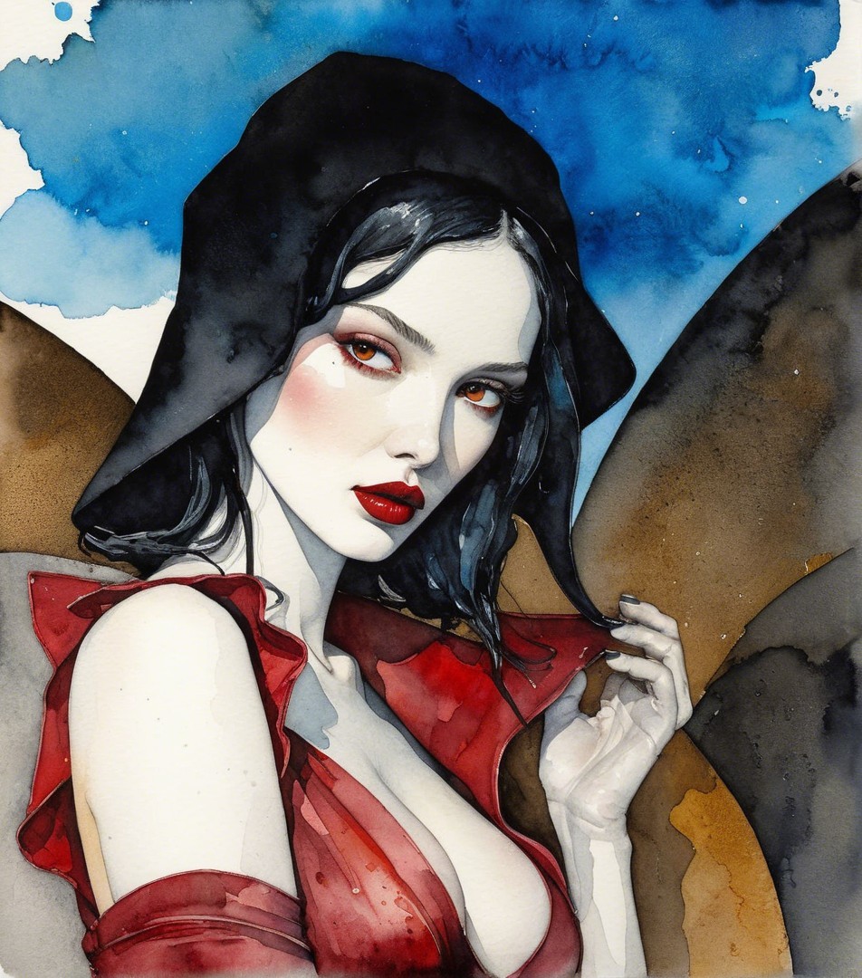 Prompt: Stylized portraiture, watercolor and ink art by Dave McKean. Surreal, whimsical details. Scratchings, hatching, contoured. inspired by Moebius and Enki Bilal & Dan Witz, plasticity 1.4, wet on wet watercolors. Dark red lips, multi-layered eyes, stippled, blotted, tesselated, emulsion shifts, transitions, catenaries, beautiful indirect light, debeh, bokeh, dof, multi-textured eyes, textures reminiscent of petals and filaments, micro-pen lines, faded ink style, unparalleled detail, paper fibers visible, plasticity 1.6, dynamic lighting 1.6, ambient occlusion, hues by Overton Loyd, raytraced shadows 1.3, pastel tones in a simplified color scheme, irregular strokes and squiggly lines for a harsh touch, dyed art with parallax occlusion and subsurface scattering, drawing inspiration from Devin Allen & Jacques de Loustal, merged styles of Gabriel Pacheco, Isabelle Arsenault, Man Ray, Overton Loyd, intricate details, pastel tones in a simplified color scheme, irregular strokes and squiggly lines for a harsh touch, dyed art with parallax occlusion and subsurface scattering, bio-luminescent gouache motif, line-art by Juan Gris and Man Ray and Piet Mondrian, moody, eerie, strange, ghostly, brightness 1.9, translucent, layered, eerie, dark fantasy reminiscence, fine lineage, wide perspective, only curves, dynamic lighting 1.7, softened, great depth and scale, american gothic 1.7, rim lighting, impossible light transitions, divisionism, sculpted inspiration from the styles of Michael Cheval, Ho Baron, Man Ray's vivid color palette. high coloring, pastel tones 1.3, unique, quaint, buxom, raunchy, skilled by Remedios Varo, visible textures, defined lineage, american gothic 1.3, overall composition by Sherry Akrami, fusion of geometrical styles with elements of foampunk, detailed line art, patterned reminiscent of Paul Kidby, intense color palette with HDR and UHD,