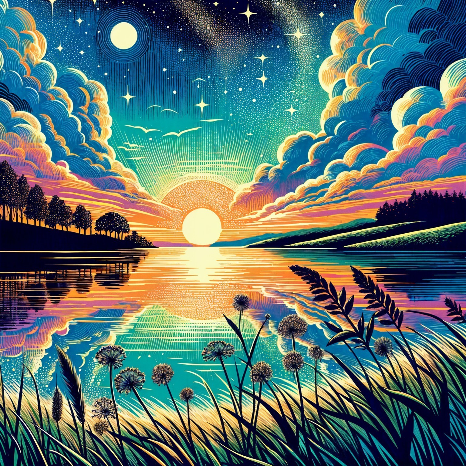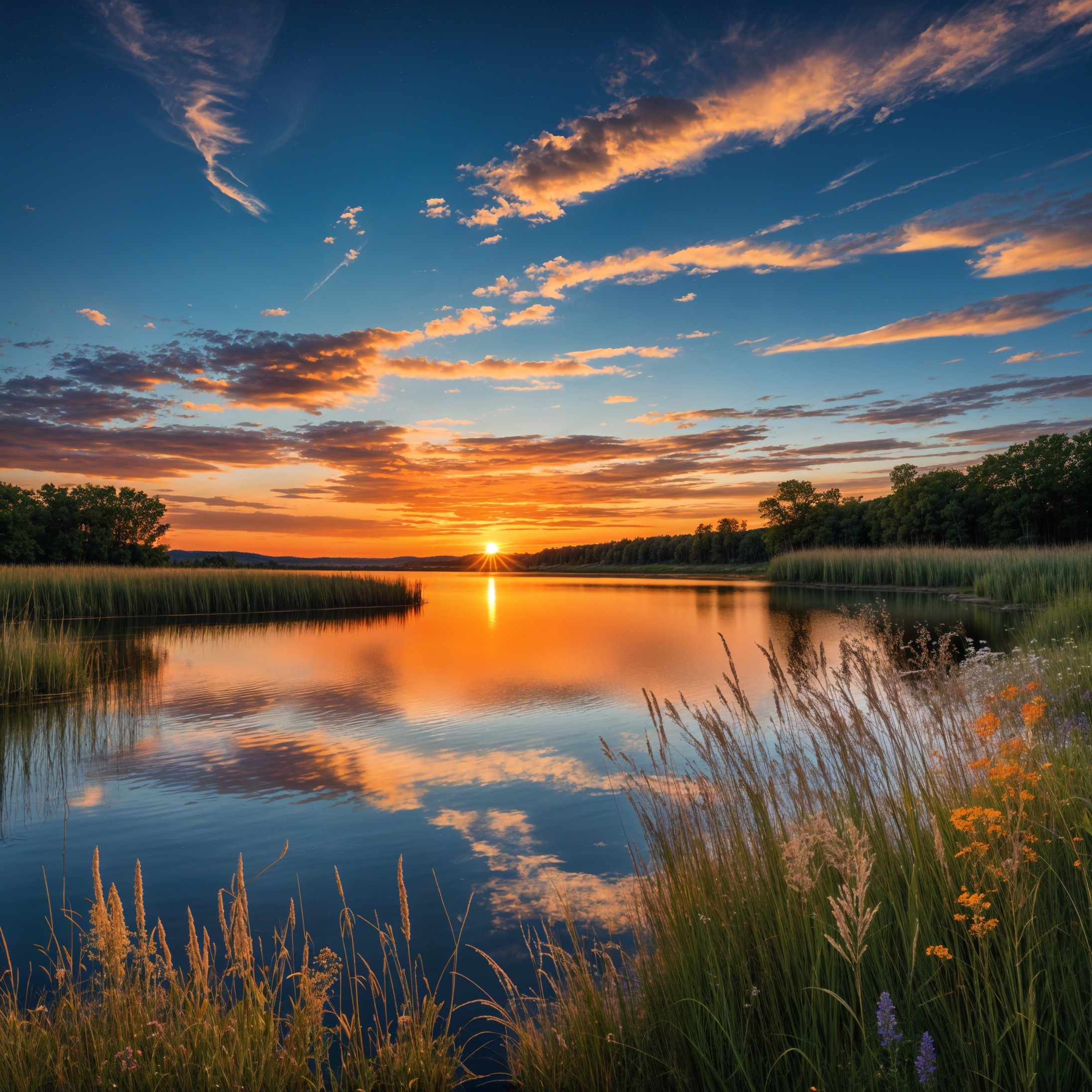 A serene lake reflects a vibrant sunset, with hues of orange and blue in the sky. Tall grasses and wildflowers frame the water, creating a peaceful, picturesque landscape.