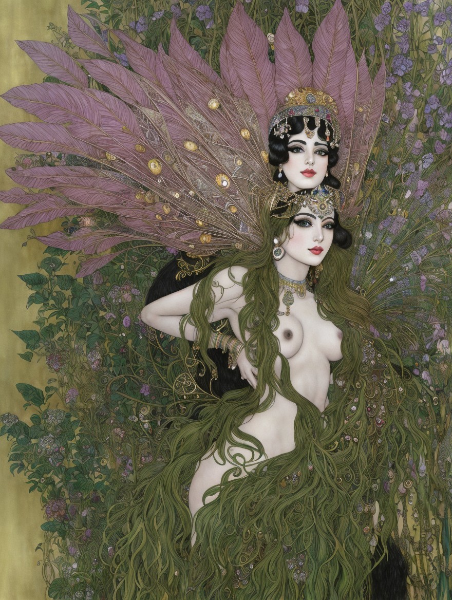 An illustrated woman with an ornate headdress, blue gemstones, and intricate clothing amidst a backdrop of stylized foliage.