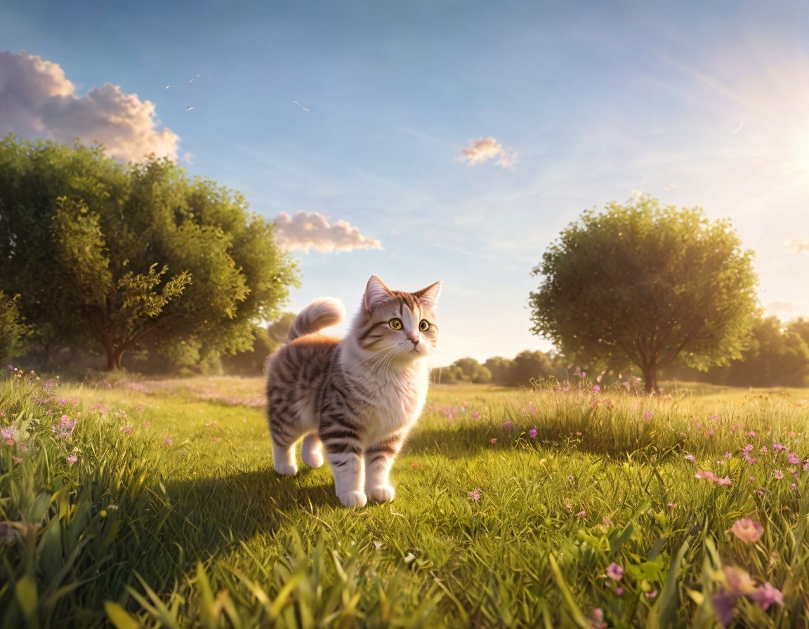 Prompt: "Photo-realistic image of a fluffy cat running in a sunlit meadow, capturing the essence of a sweet Pixar movie scene, ultra-realistic detailing on fur and surroundings, high resolution, vivid colors, like a scene from a beloved animated film."