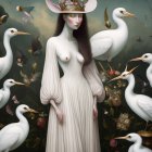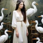 The image features a central figure in a flowing white gown, surrounded by elegant birds and golden ornaments. It combines ethereal beauty with a mystical, dreamlike atmosphere.
