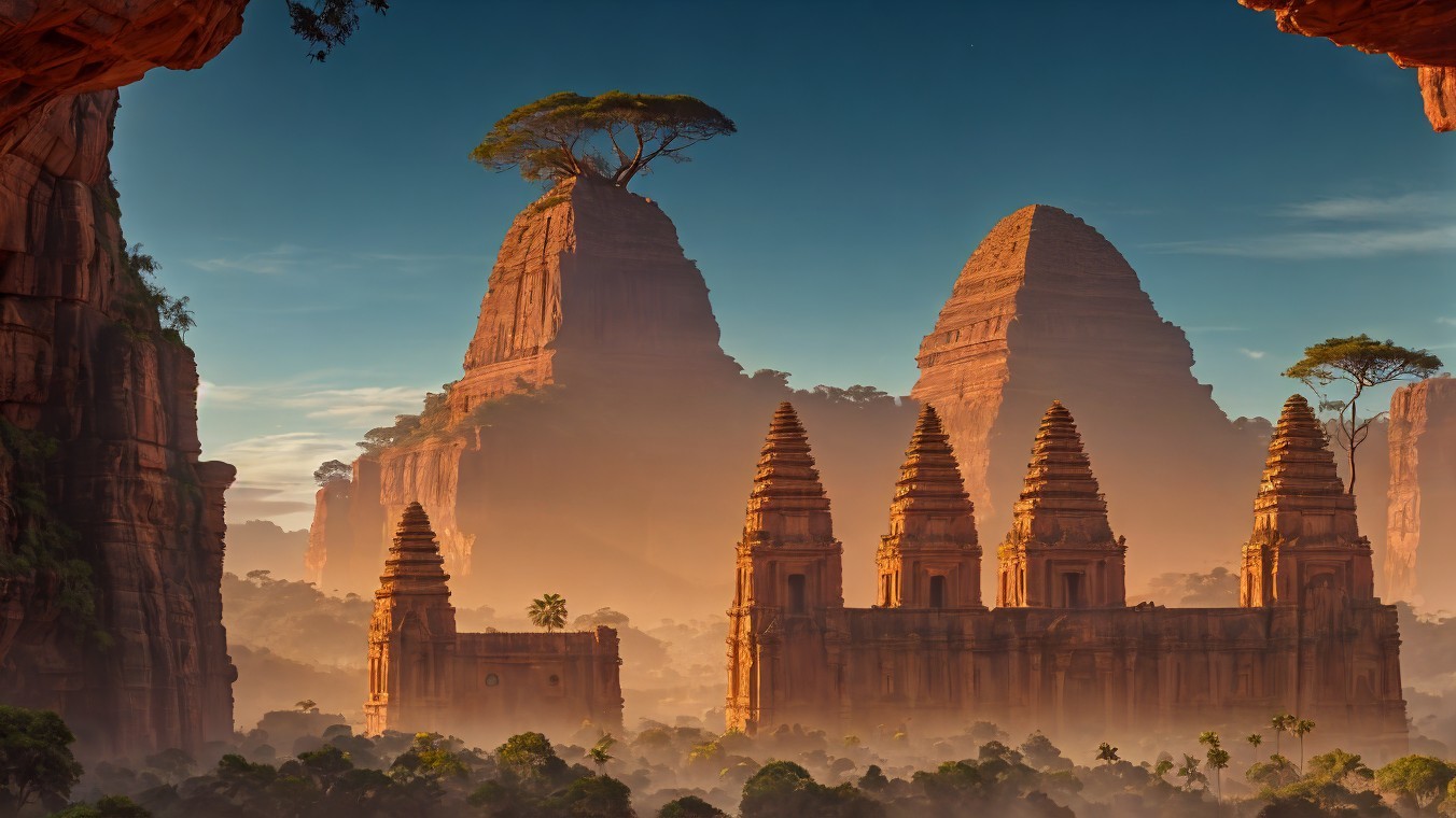 A serene river landscape flanked by tall, ancient red temples under a clear sky with birds and lush greenery.
