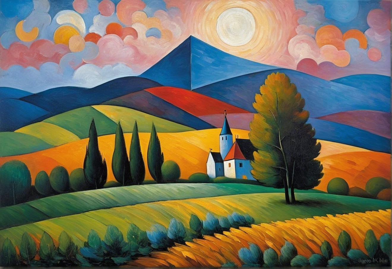 A rural landscape of olling hills in warm hues. A church is among trees, and the sky is bright with sun and clouds. A peaceful rural scene filled with colour.