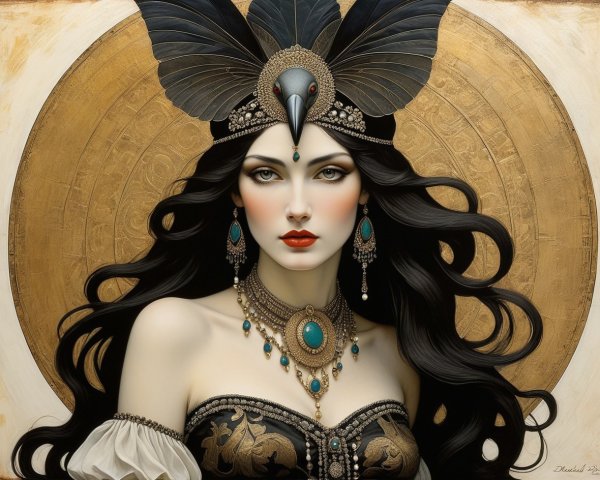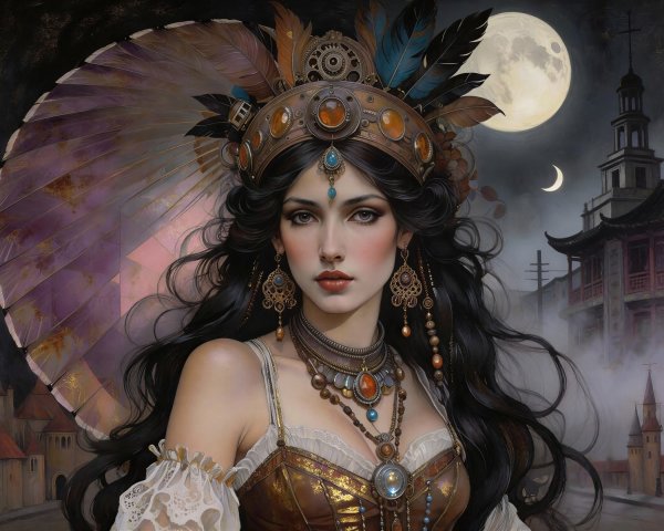 The image features a woman with an elaborate headdress adorned with colorful feathers, beads, and traditional attire. Her serene expression complements the vibrant design and soft background.