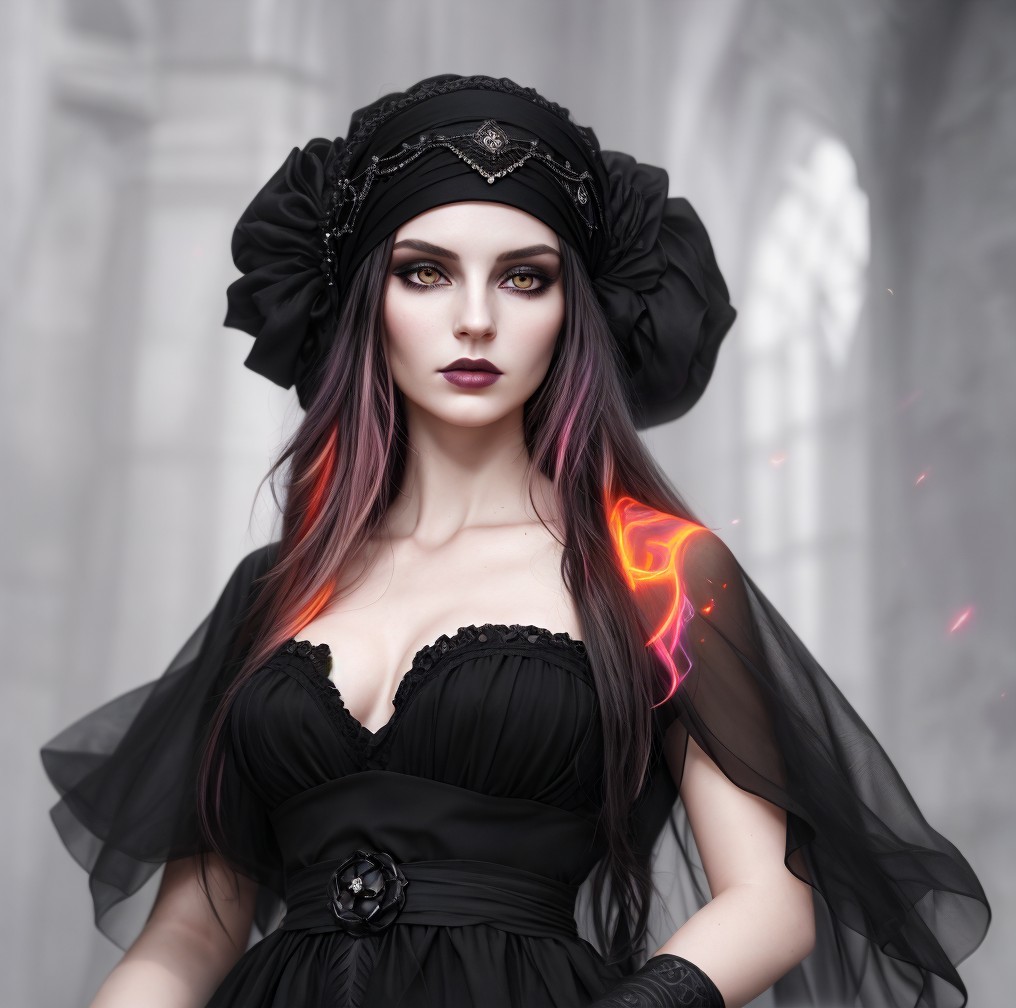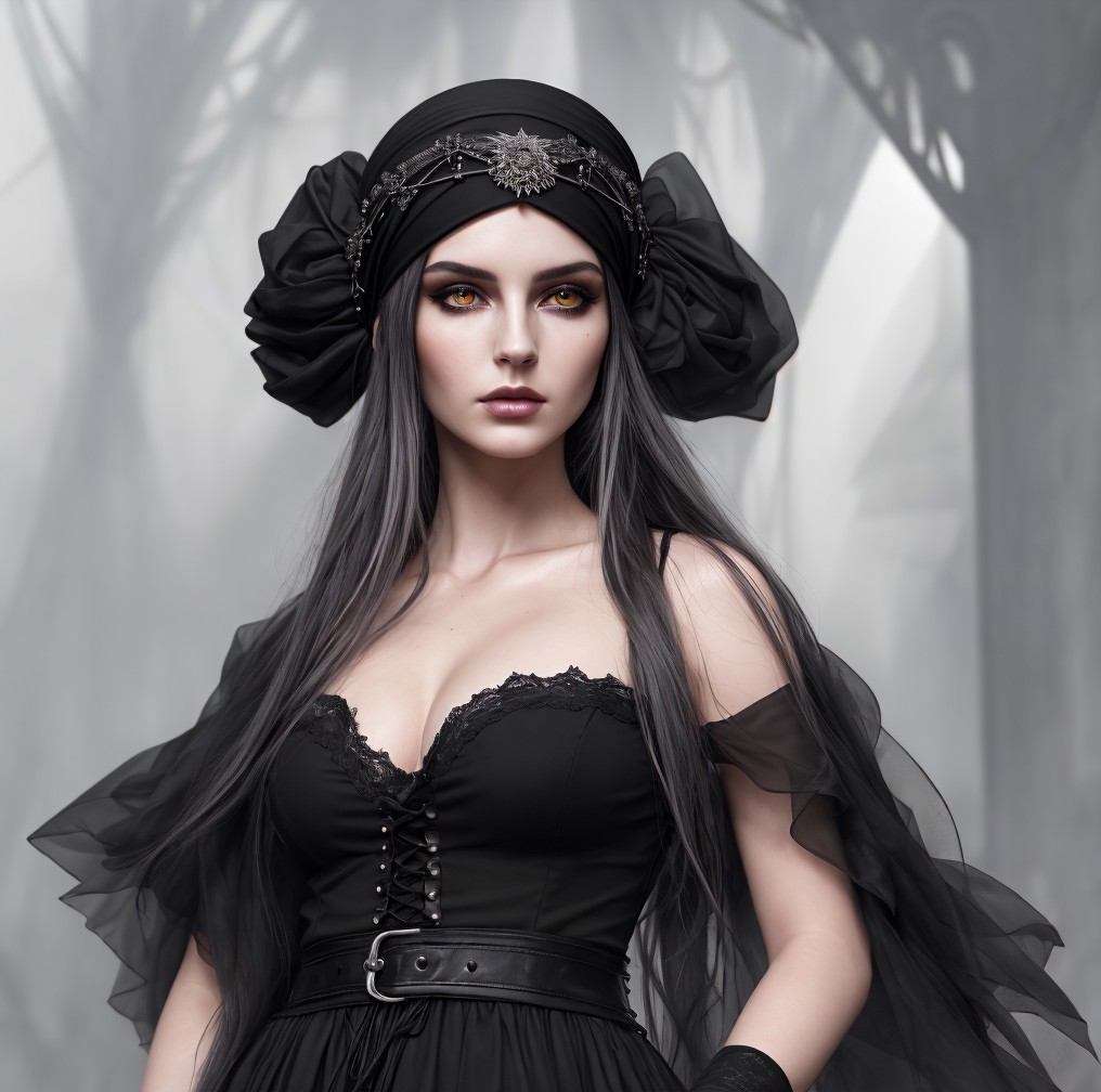+ Prompt:Style of highly rendered digital artwork, Colored line drawing, portraiture of beautiful dark rock female wuth Intense and mysterious aura, glowing biomorphic eyes, dark occultism, gothic rock headband and headscarf, greys background, pale skin , black untrusted hair, wavery texture, complexion 1.4, radiance, maximalism, weary, scruffy, grunge, shabby chic, encaustic strokes, shiny reflections, gaze, textured pattern,, intricate jewellery necklace blending tribal and metallic aesthetics, confident, coherent, dystopian 1990s advertising art style, raw eerie expression. Reddish-brown full lips, intricate geometric crochets and frilly details, feathered cloak with deep crackles, secretive brown auburn curly hair, antique brass details, aura of secrecy and magical realism, dimly back-lit, grain, misty, mysterious environment, gothical, devilish eyes 1.7, 3d effects 1.8, ambient occlusion 1.5, bioluminiscent details, anisotropic filtering 1.7, raytraced shadows 1.8, retrofuturistic details, spiritual essence, synthetic, style of Margaret Keane and Didier Lourenço and Dee Nickerson and William Turner and Overton Loyd, space age style merged with storybook illustration style,
