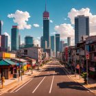 The image depicts a vibrant, paper-cut style town scene featuring buildings with striped awnings, green trees, and a sunny sky with clouds, creating a cheerful, whimsical atmosphere.