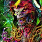 A vibrant, surreal depiction of a menacing figure wearing a hood, surrounded by intricate patterns and cosmic elements, exuding a powerful, otherworldly presence. Bold colors enhance the visual impact.