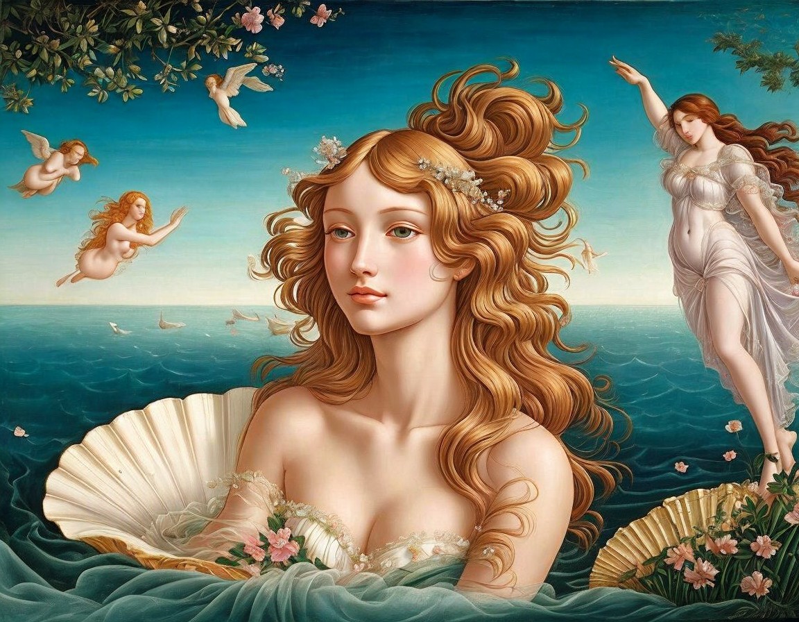 Prompt: "Majestic birth of Venus scene, ethereal woman emerging from a seashell, surrounded by other women in a lush landscape, classical birth of Venus depiction, Sandro Botticelli-inspired masterpiece, Botticelli style with a modern twist, intricate details reminiscent of Botticelli's artistry, graceful figures in a harmonious composition, soft pastel colors, flowing garments, delicate facial features, mythological setting, enchanting and dreamlike atmosphere, expertly crafted by a contemporary artist, art gallery showcase."
