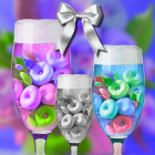 A vibrant illustration featuring three elegant glasses filled with colorful flowers. Soft hues of pink, blue, and purple create a cheerful backdrop, complemented by a delicate silver bow.