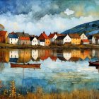 A serene landscape features colorful houses along a calm lake, their reflections creating a vibrant symmetry. Two small boats float nearby, set against a backdrop of soft mountains and a bright sky.