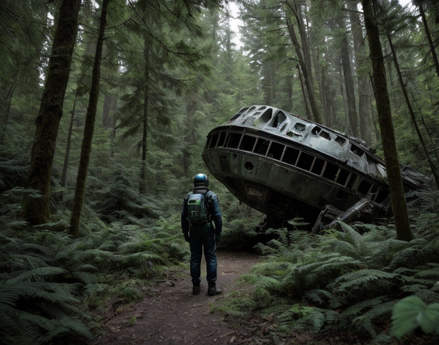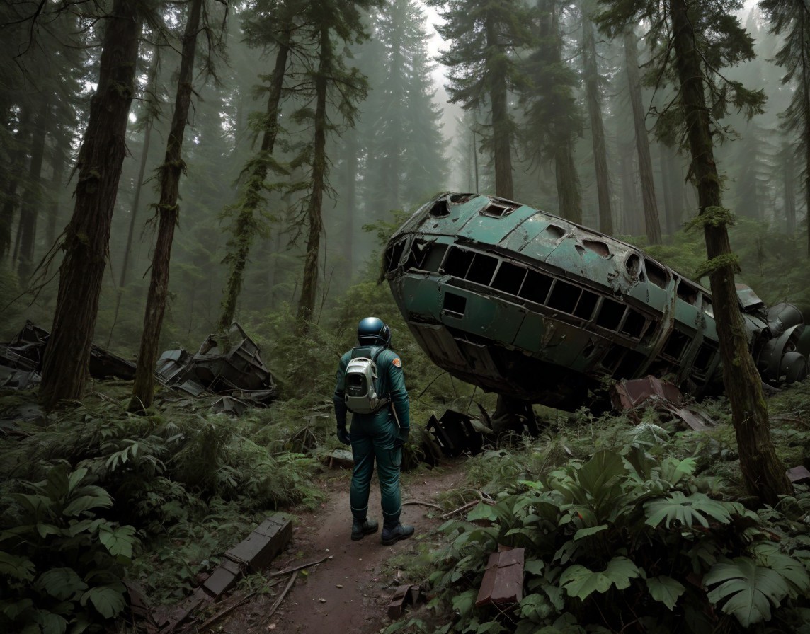 A person in a green spacesuit observes a dilapidated airplane in a foggy forest, conveying an eerie post-apocalyptic scene.