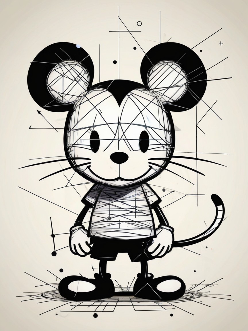 Make me a diaphonized sandwich head in Mickey shape :: Hyaline glitch chaos draw a cat using only straight lines to break complex forms into simple geometry, by reducing something as fluid as a cat to straight lines (( graffiti cel shaded / warli like )) change its composition, proportion, and the visual logic at the core of modern surreal design :: glitched zen lines abstract fuzzy wide brushstrokes by Henry Asencio { Pino Daeni art style elaborated as shaped by Remedios Varo's Masterpiece by Wassily Kandinsky, Franz Marc and Lyubov Popova}