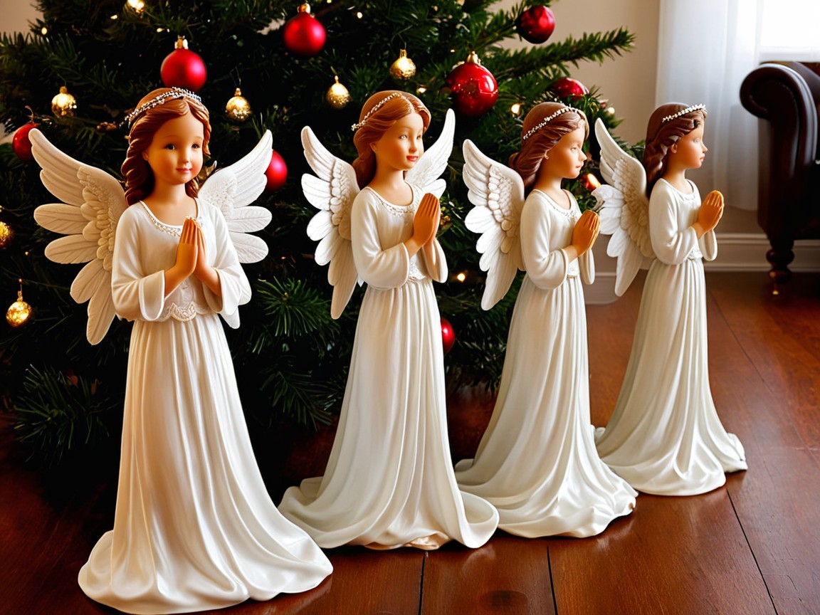 Four angel figurines stand in front of a decorated Christmas tree, with realistic details. The angels wear white robes, have long brown hair, and are adorned with crowns. Their hands are clasped in prayer. The angels are of varying heights, from tallest on the left to shortest on the right, and