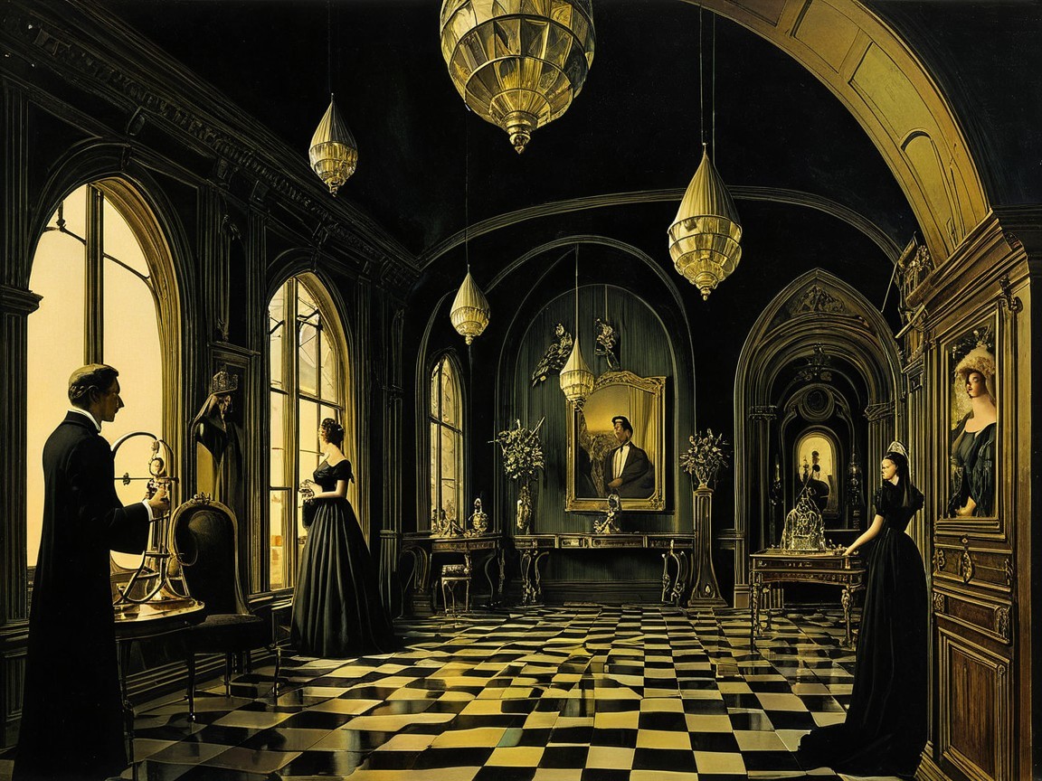 An opulent hall with a checkered black and gold floor. A tall man in a black suit with his back turned to the viewer is holding a gold object on a table on the left. A woman in a black elegant dress looks out of a tall, arched window in the center. Another woman in a