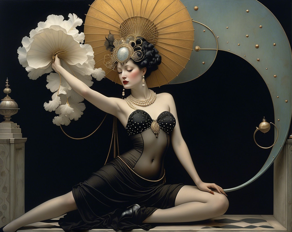 A captivating figure in a black polka-dotted gown poses gracefully, adorned with a striking headpiece. She sits amidst ethereal clouds and ornate architectural details, evoking a sense of grandeur.