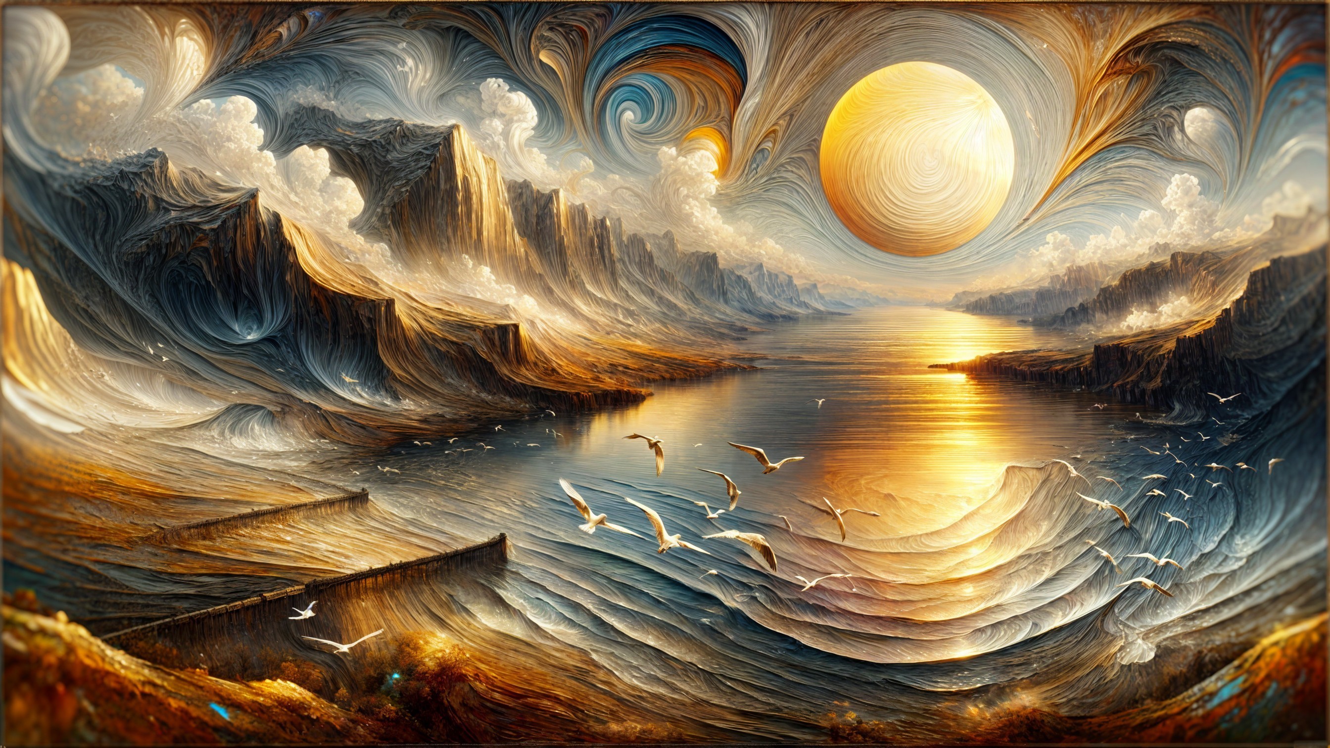 Prompt: bird's-eye view: the sky is covered with a transparent veil. The disc of the Sun is golden-yellow with iridescence, hanging over a chain of mountain ranges. Its light is reflected in the serene surface of the bay, resembling a mirror-like surface with a copper tint and soft wavy curves. Execute the following details in oil: Seagulls over the water, describing intricate trajectories. A passenger train speeding along the coastline. Wide-angle lens, realistic landscape with elements of impressionism, soft, thick strokes, whimsical contrast, dynamics, magical highlights on the calm water, shades: golden, copper, blue, orange, brown, white, shadow ink.