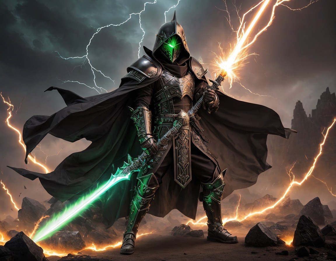 A menacing figure in dark armor with a skull mask holding a green lightsaber and a fiery sword stands atop a rocky terrain..