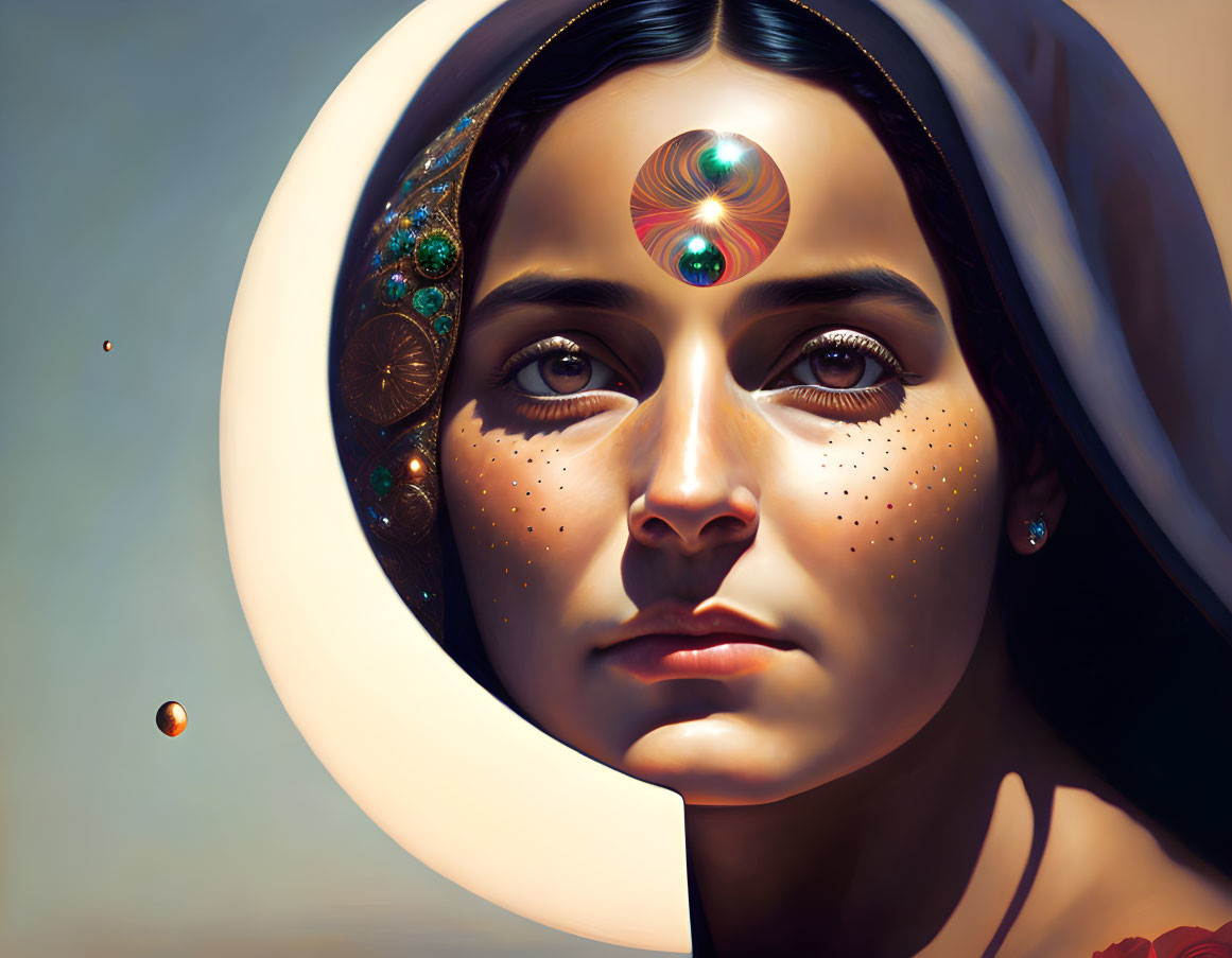 Portrait of beautiful young bejeweled mother, with the earth inside a visible tear resting on her cheek