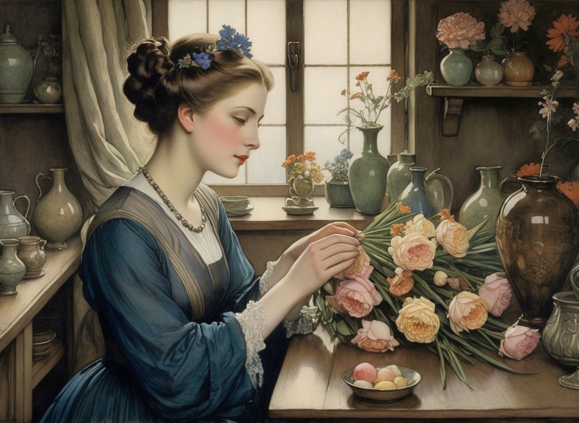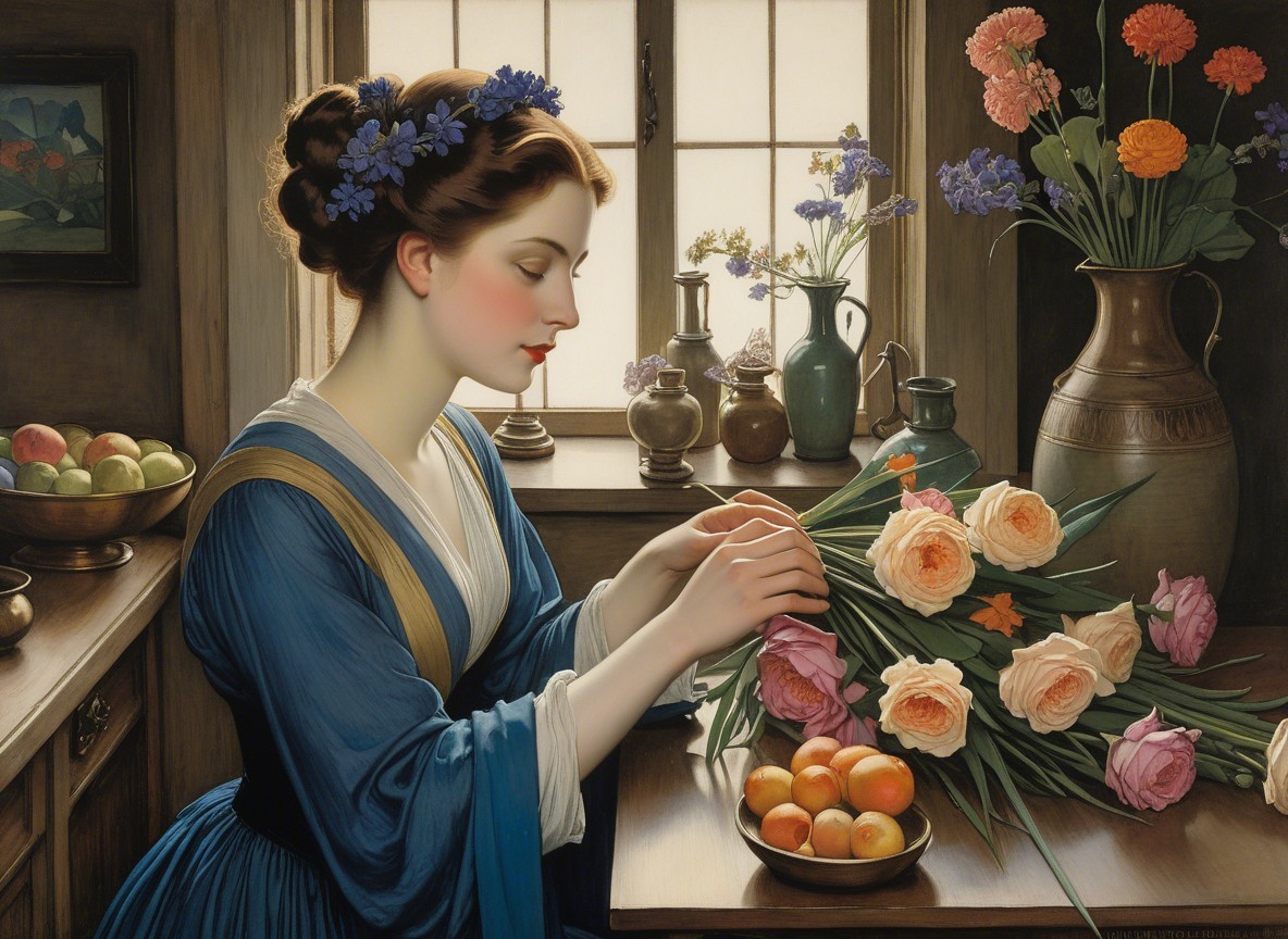 A serene woman with flowing red hair sits at a wooden table, gently touching a glowing object. She is surrounded by vibrant fruits, a teapot, and a soft morning light streaming through a window.