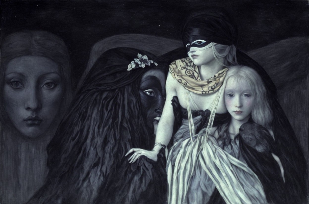 The image features a haunting, surreal scene with three figures: a masked woman draped in dark attire, a ghostly child, and shadowy faces in the background, all enveloped in a mysterious atmosphere.