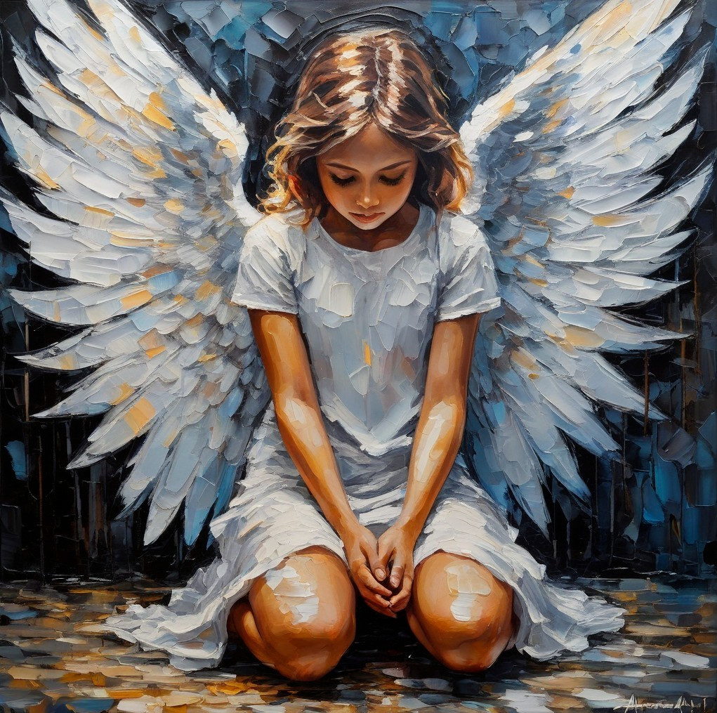 Prompt: fallen angel child, figurative impressionism, Acrylic on Canvas in the style of Aleksandra Ćaldović, impasto, expressive, muted pallet, kneeling, by Satori Canton. she is the creator of light, lights densely packed, mimicking contours and features of her form, bio-luminescent, translucent, cinematic, Film light, side view, surreal hallucinatory intricately detailed, flickering lights, suggestive, captures viewers with beauty and mesmerism, Hyper detailed, Hyper realistic, masterpiece, atmospheric, High resolution, Vibrant, clear crimson, clear amber, High contrast, dark angle