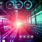A vibrant digital landscape featuring a glowing globe at the center, surrounded by screens displaying colorful data visualizations, hexagonal patterns, and dynamic lines of light, creating a futuristic atmosphere.