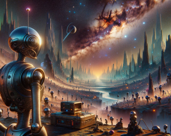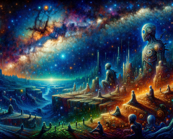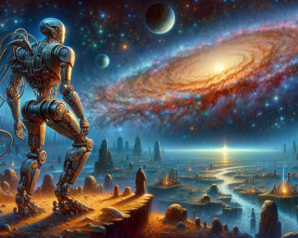 A mystical figure stands in an enchanted setting, dressed in a flowing, light blue gown with lace details. Her long, wavy hair cascades down, complemented by ethereal ambiance and dark surroundings.