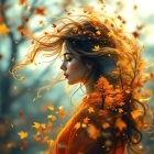 A young woman with flowing hair is surrounded by vibrant autumn leaves. Her serene expression and the golden hues of the leaves create a captivating, seasonal atmosphere.