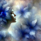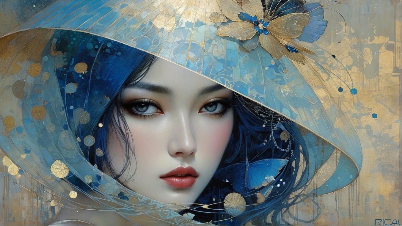 A portrait of a woman with dark, flowing hair, wearing a beautiful, wide-brimmed hat adorned with flowers. Her striking features and bold red lips create an enchanting, artistic vibe.