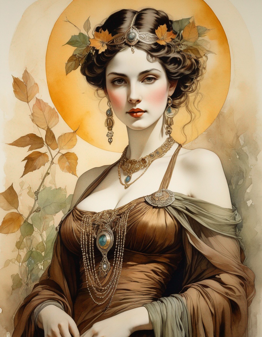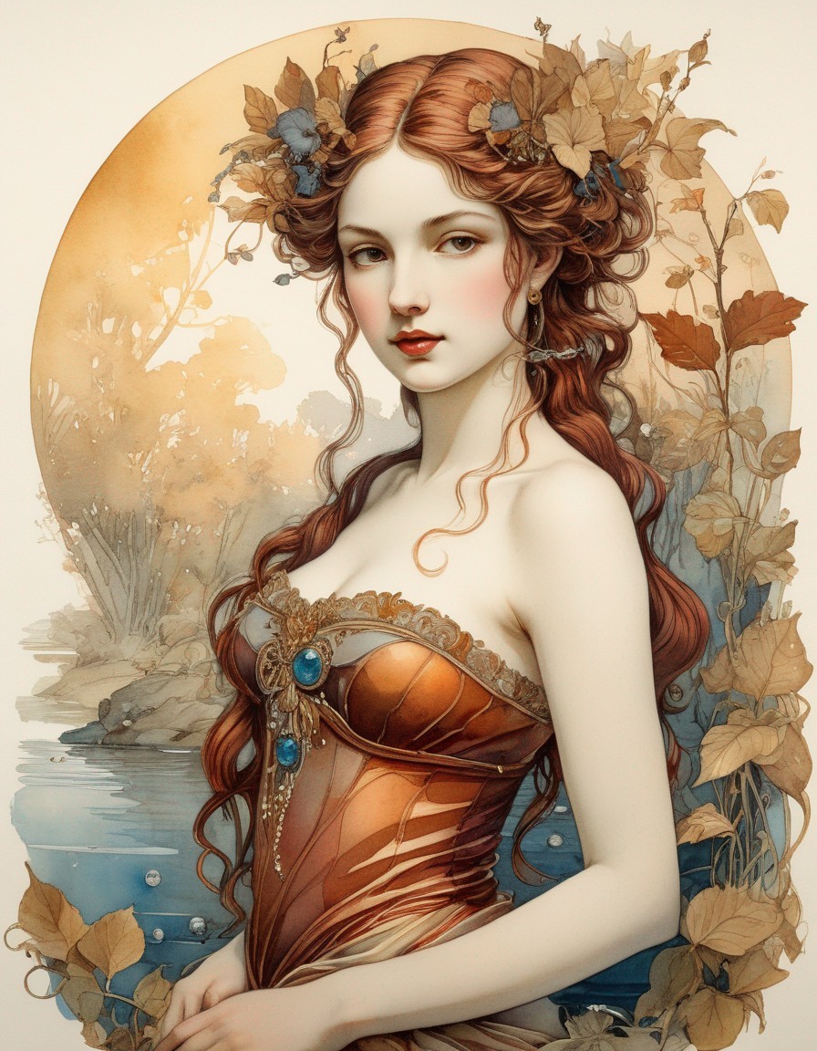 Naiad, potameides by a beautiful river. colored ink drawing, watercolor artwork on old withered paper, vintage, by Caravaggio, Fragonard, Anton Pieck, pale colors, high detail, intricately detailed, hyperdetailed volumetric lighting, art nouveau graphic steampunk., whimsical, beautiful, poignant, touching. colors indigo, gold, rust, burgundy, black.soft watercolor extra water in Art Deco by Annigoni, Egon Schiele, Milo Manara, Botticelli, Catrin Welz-Stein, Jean Metzinger, Klimt, perfect eyes, perfect handsface, highly detailed, complementary colors, hyper detailed. Watercolor and ink splatter, dynamic pose, dark blue background, unreal engine, greg rutkowski, loish, rhads, beeple, makoto shinkai and lois van baarle, ilya kuvshinov, rossdraws, tom bagshaw, alphonse mucha, global illumination, detailed and intricate environment