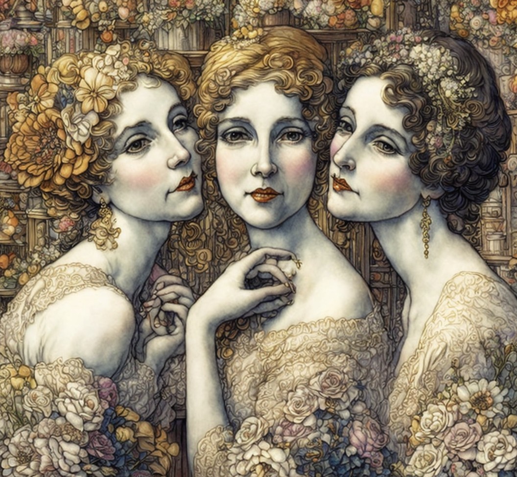 Three elegantly dressed women with soft, curly hair and floral decorations smile warmly together. They stand in front of a shelf filled with jars, exuding charm and vintage grace.