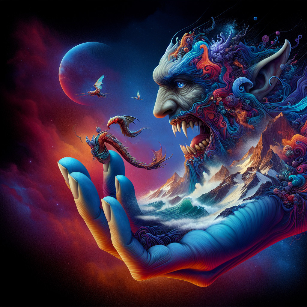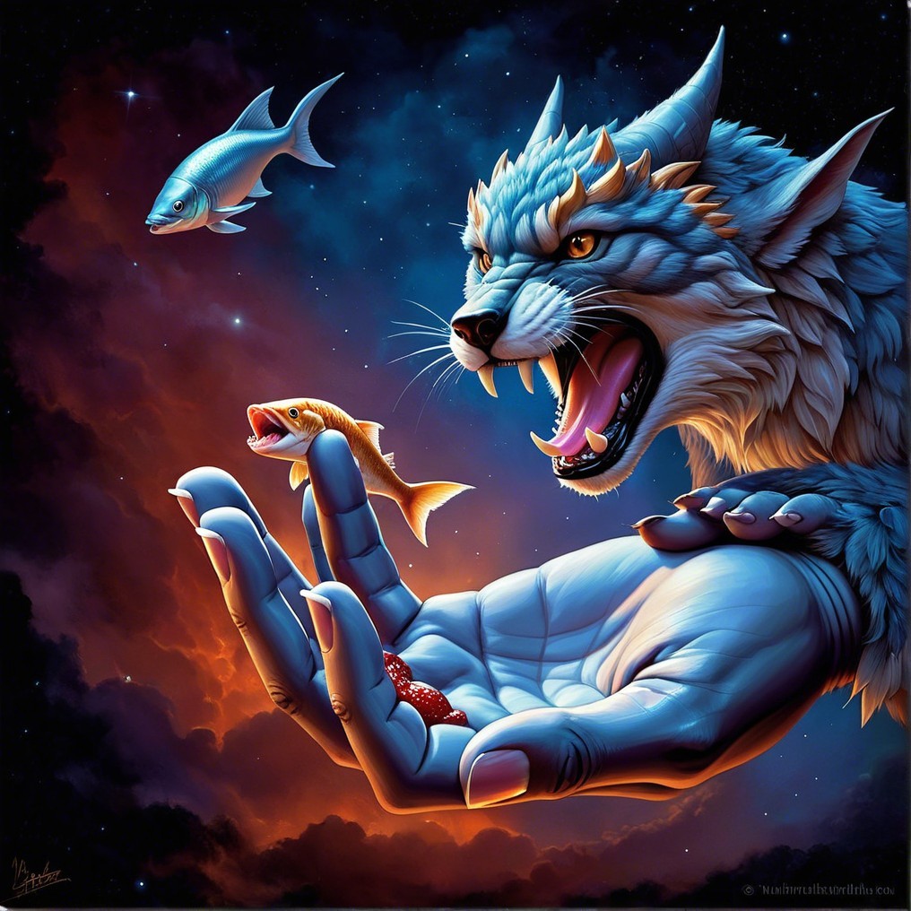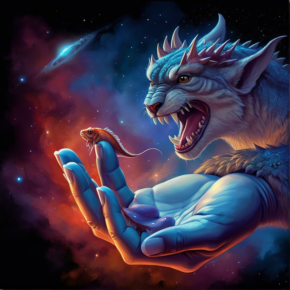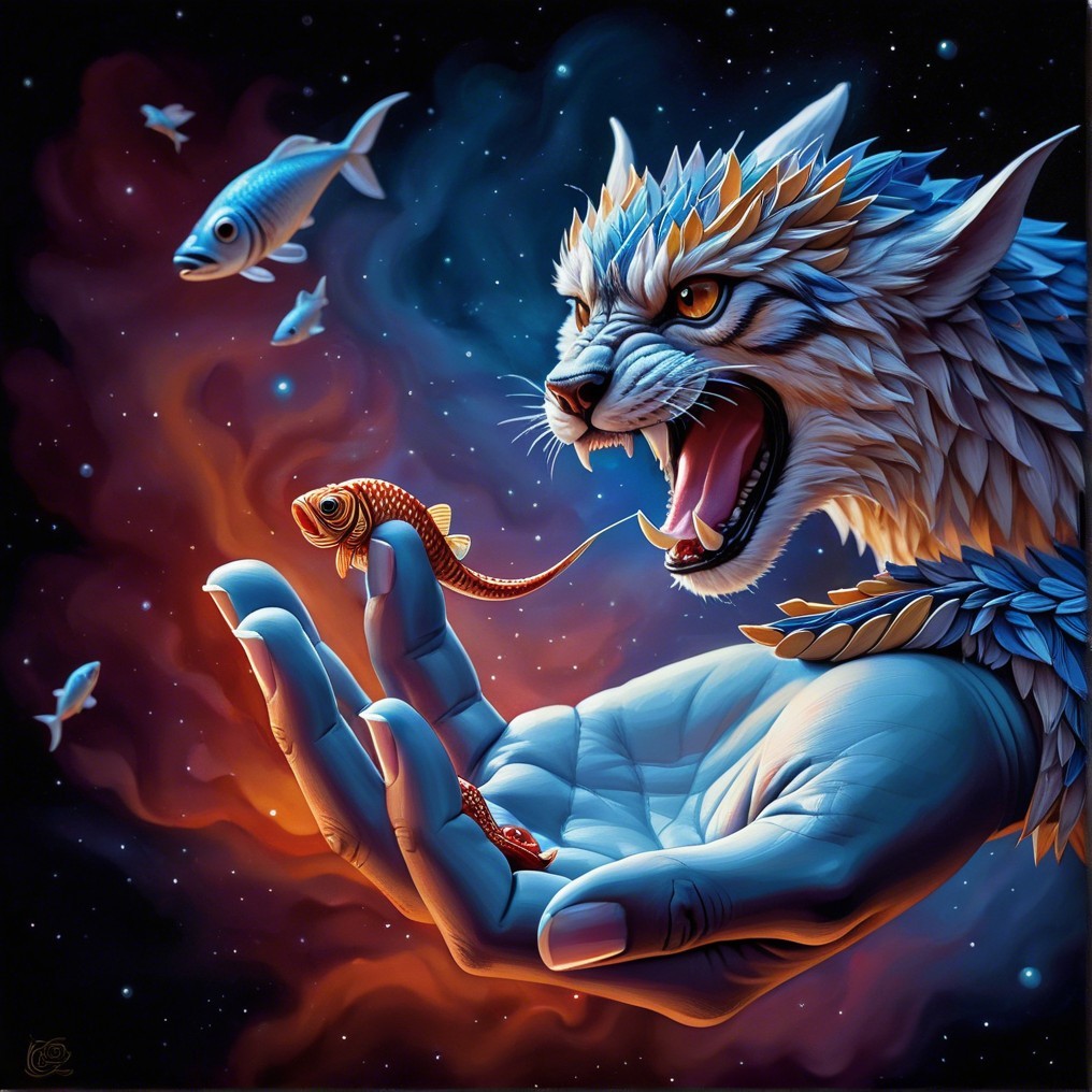 Surreal Scene of Lynx on Human Hand with Cosmic Fish
