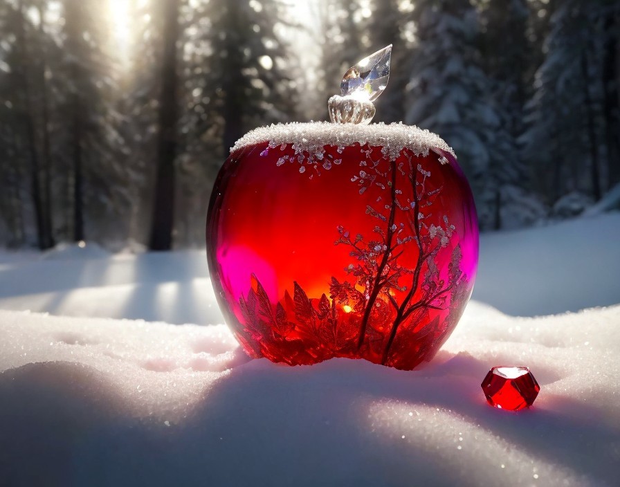 Prompt: "red apple made of crystal laying in the snow in the forest, a masterpiece, ethereal fantasy hyperdetailed mist Thomas Kinkade glass red currants by Faberge against the background of a tray and jug made of old blackened silver with fancy filigree, carving and chasing, very fine filigree work, careful creation of every detail, in an insanely detailed line, perfect composition, masterpiece, intricate details, HDR, beautifully shot, hyperrealistic, sharp focus, 64 megapixels, perfect composition, high contrast, cinematic, atmospheric, moody"